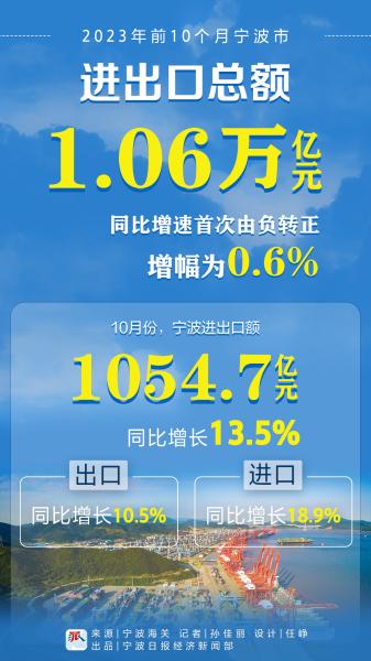 據(jù)寧波海關(guān)數(shù)據(jù)顯示,前10個月,寧波進出口總額達1.06萬億元,同比增速今年以來首次由負轉(zhuǎn)正,增幅為0.6%。其中,出口額超6900億元,同比增長1.5%;進口額超3600億元,同比降幅較前9個月收窄1.9個百分點。